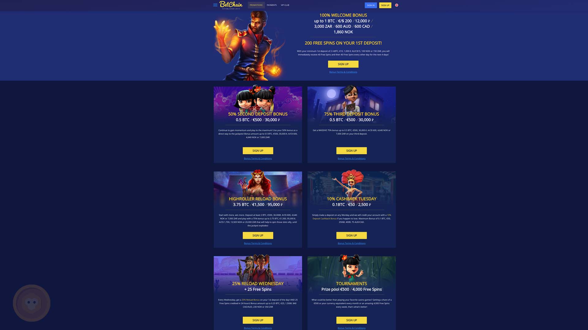 - The Welcome Offer at BetChain Casino covers not just the first but also the second and third deposits placed by new players. Players can expect a 100% match bonus of up to 1 BTC on the first, a 50% match bonus of up to 0.5 BTC on the second, and a 75% match bonus of up to 0.5 BTC on the third deposit.