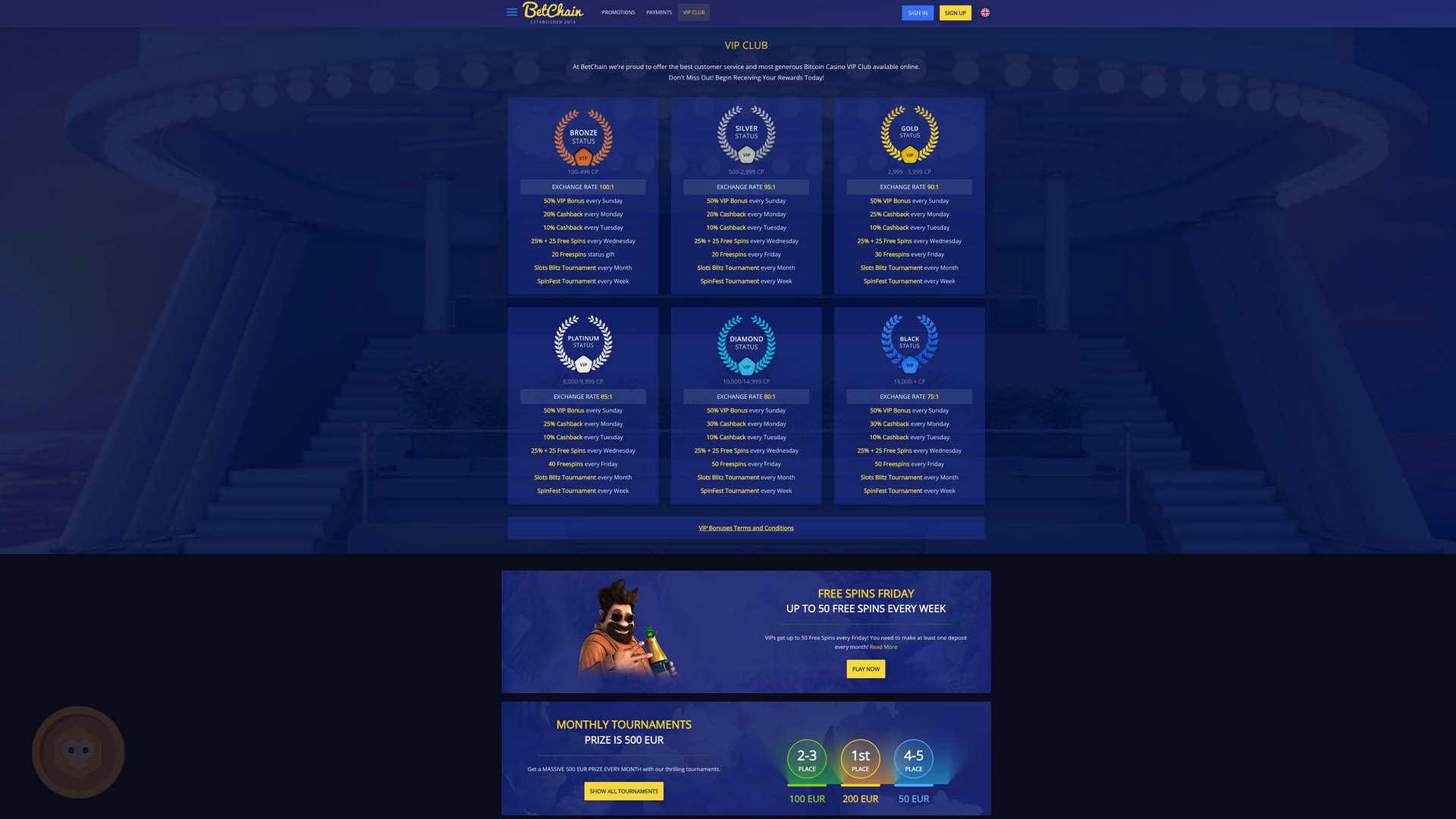 - The VIP Club includes comp points given to all players for every 50 to 300 mBTC wagered on casino games. They can reach six different VIP levels and enjoy extras like special bonuses, cashback deals, free spins, and more.