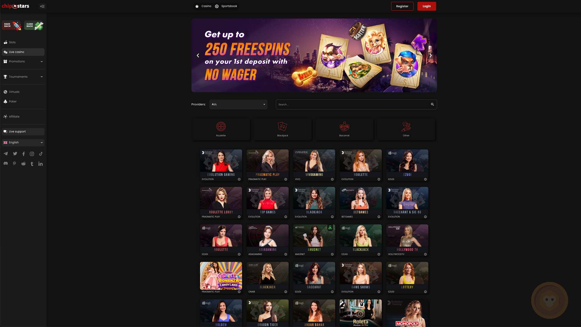 Those who prefer playing games in real-time with live hosts/dealers can head to the section dedicated to live casino games at Chipstars Casino. There, they will find dozens of titles divided into four categories: roulette, blackjack, baccarat, and others. So, in addition to the variants of well-known games, you can also try game shows and titles like Sic Bo, Mega Ball, Fortune Wheel, and Andar Bahar.