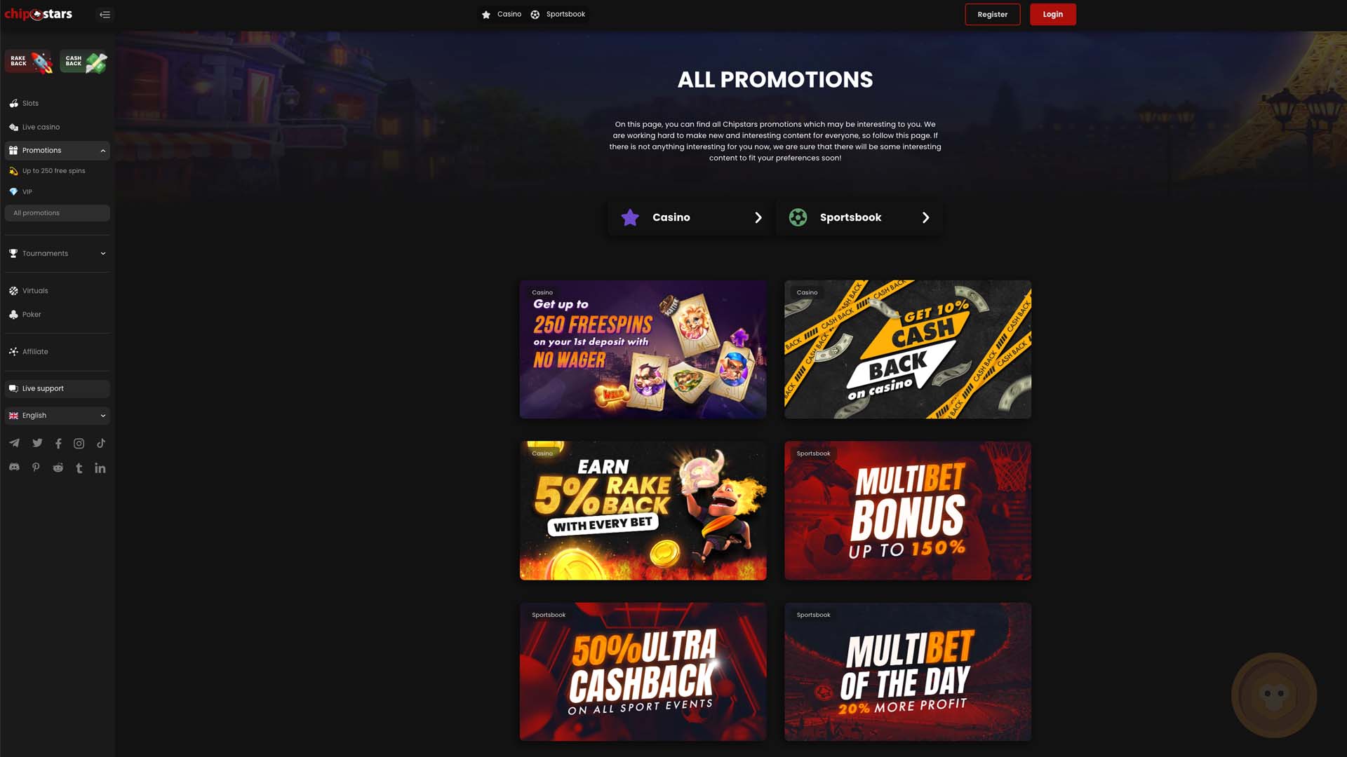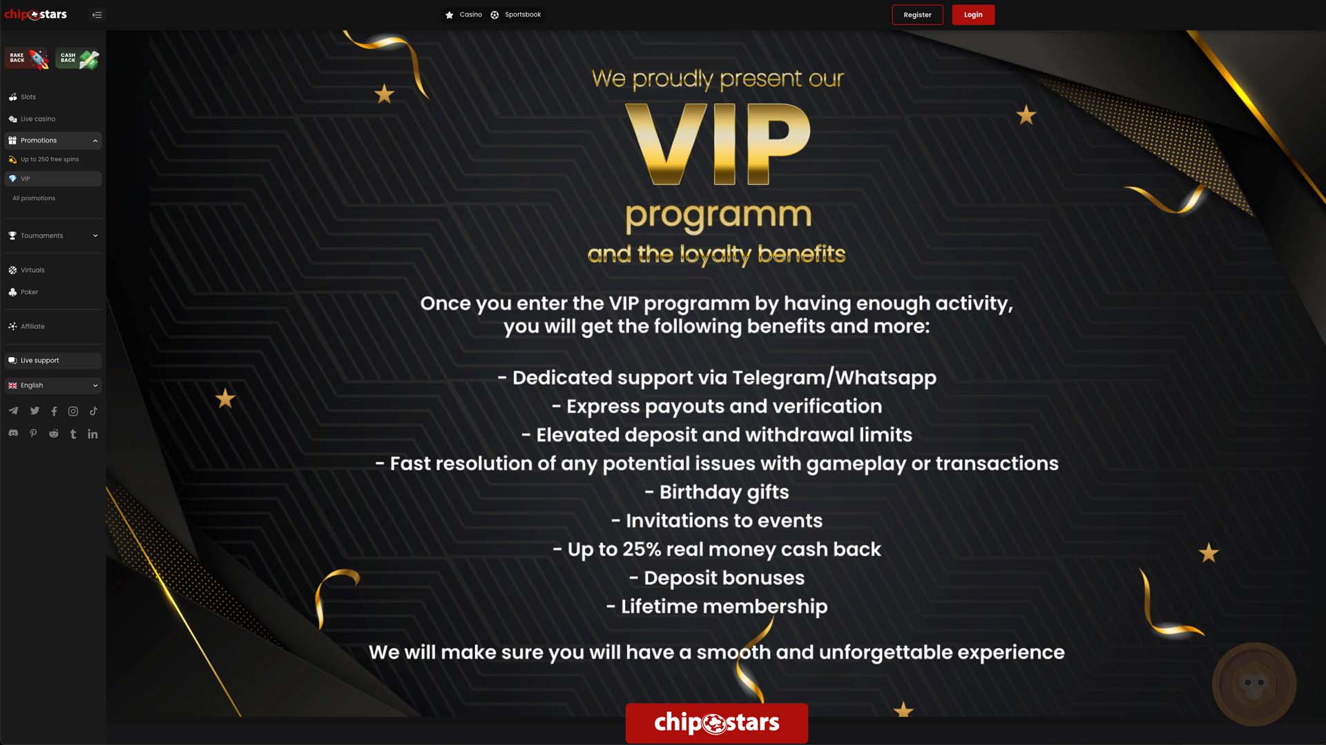 - Special Promotions are something that occurs regularly at Chipstars Casino. Sometimes they depend on the time of the year while they are used to promote new products in other periods. In any case, players can expect time-limited offers that can help them improve their balance.