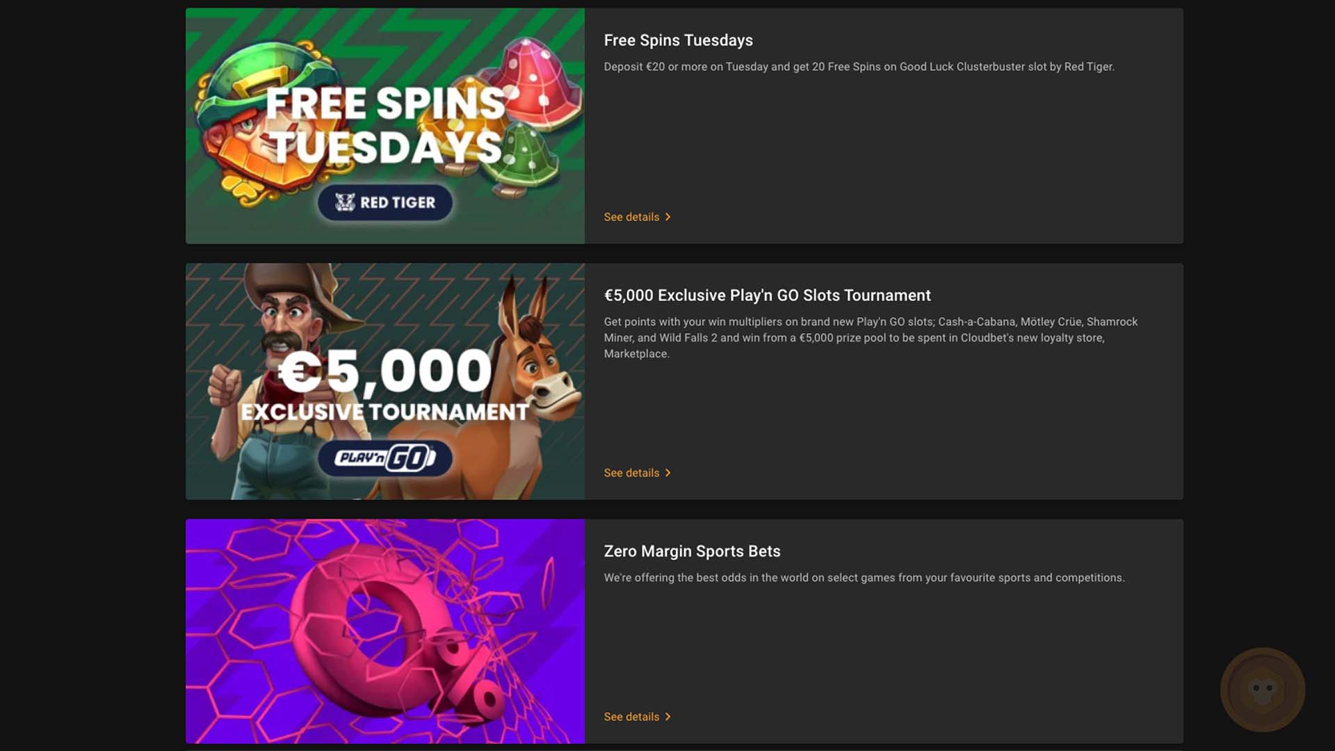 - Various special promotions are made available at Cloudbet, such as Free Spins Tuesdays. As the name of this promotion suggests, players can get 20 free spins to be used on the Good Luck Clusterbuster slot game if they make a qualifying deposit on a Tuesday.