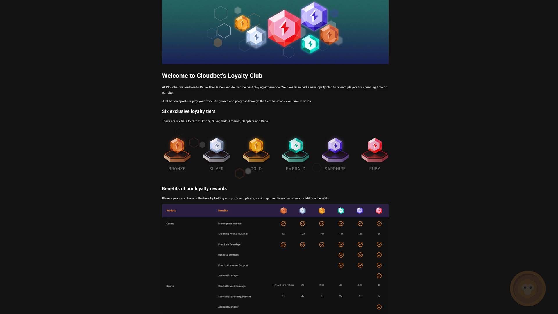 - Cloudbet Casino’s VIP program also rewards customers for making repeat visits to the site. Cloudbet’s Loyalty Club consists of six tiers to climb: Bronze, Silver, Gold, Emerald, Sapphire and Ruby. Players who make it to the top get access to a dedicated account manager and more perks.
