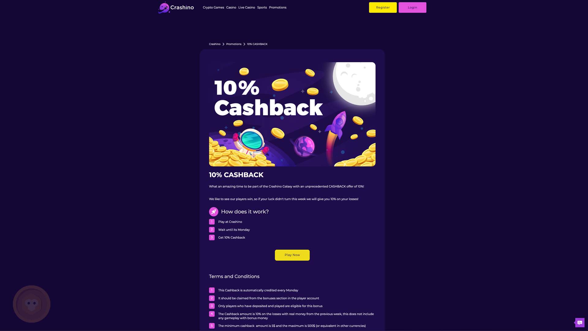 - Crashino also offers frequent Special Promotion such as Cash Back bonuses, Risk-Free Sports bets, Social media rewards, Anniversary bonuses, and 100% Express Insurance. These promotions are available across different game options and have different wagering requirements and conditions.
