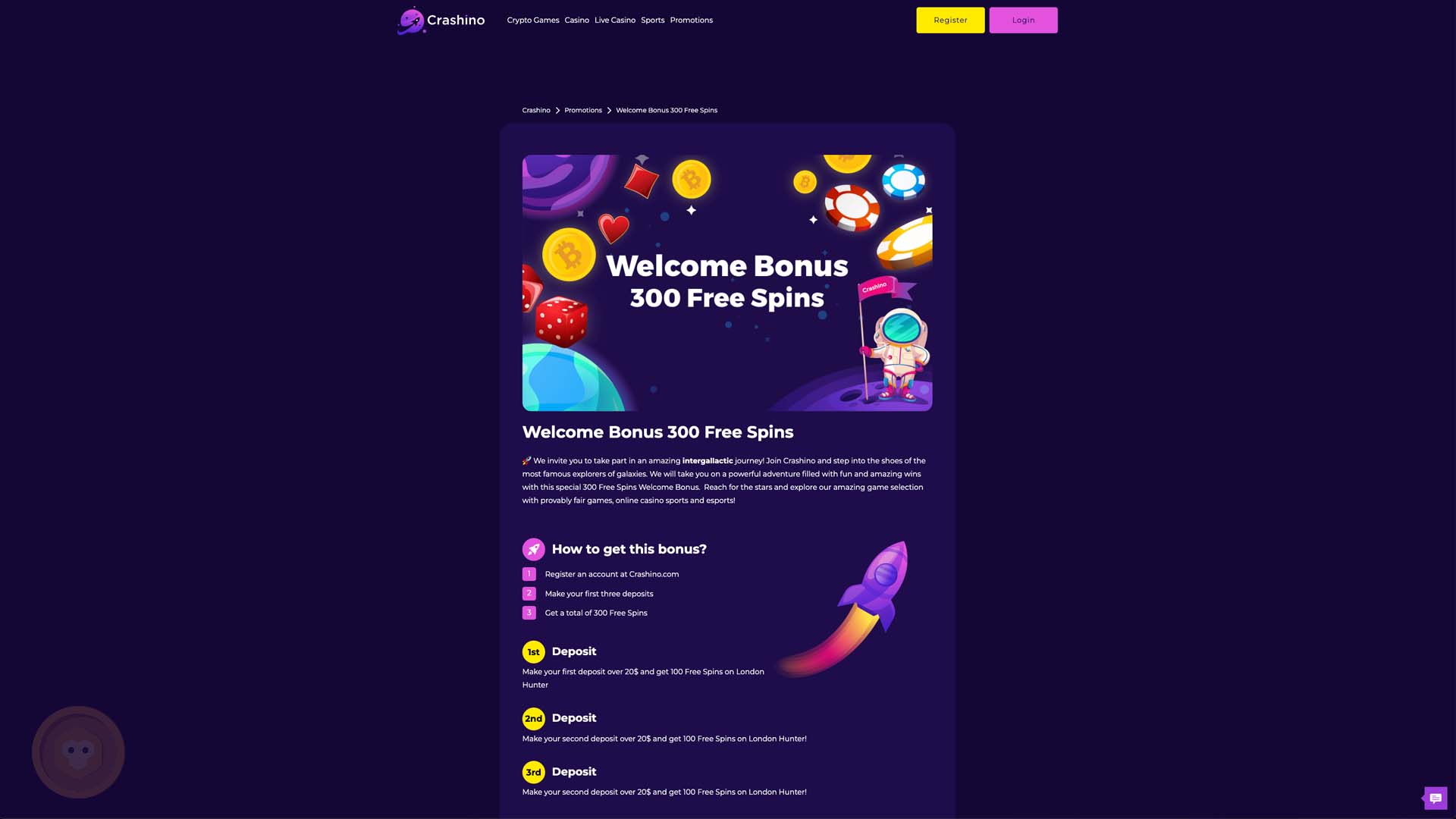 - Rich Welcome Offers provided by Crashino Casino includes including 300 Free Spins for the first 3 deposits. The casino offers 100 free spins for every $20 deposit or its equivalent in any currency, and the players can get it up to three times. This bonus is only credited to the London Hunter game and has a 15x wagering requirement.