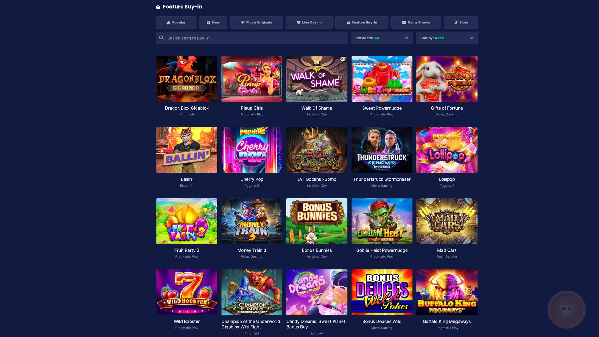 Like many online casinos, Flush Casino’s catalog focuses primarily on premium slot machines from leading software vendors. Players will find hundreds of top online slots in popular categories, such as Popular Games, New Games, or titles with Buy-in Features. Some popular online slots to play at Flush are Sweet Bonanza, Big Bass Bonanza, Gates of Olympus, and Fruit Party. This operator partners with top suppliers like Netent, Pragmatic Play, Microgaming, and other providers to offer exciting and fair games. In addition, the website also boasts a section for Flush Originals, with games like Plinko and Limbo that are provably fair.