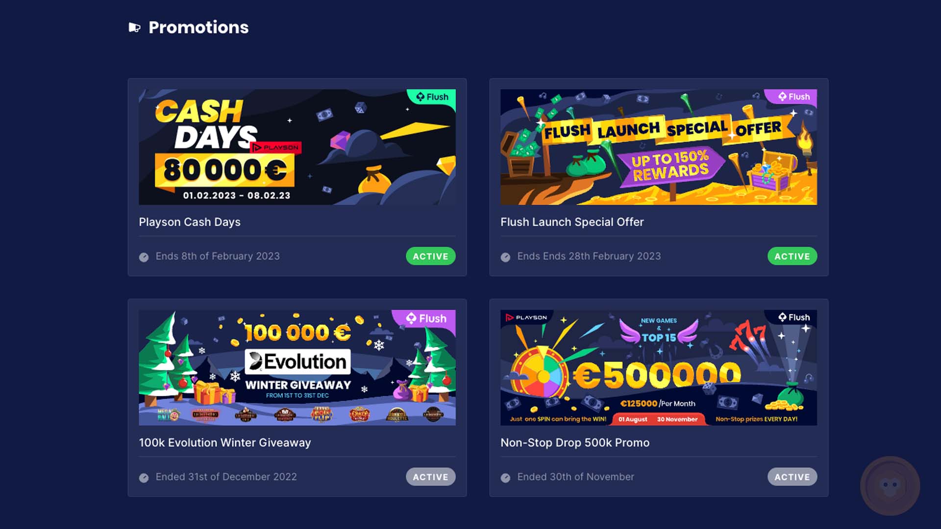 - In addition to these standard promotions, Flush Casino runs several Special Promotions like slots contests and tournaments. For example, there’s the 100k Evolution Winter Giveaway in cooperation with Evolution Gaming. Make sure to check its T&Cs for its end date and other requirements.