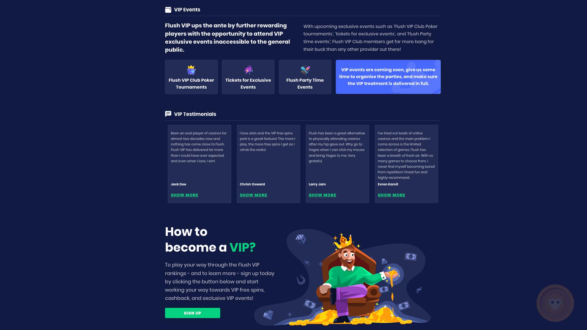 - Flush Casino doesn’t offer other Bonus Offers, but we’re hoping that the team can add reload bonuses or even cashback to make crypto gambling more exciting for experienced bettors.