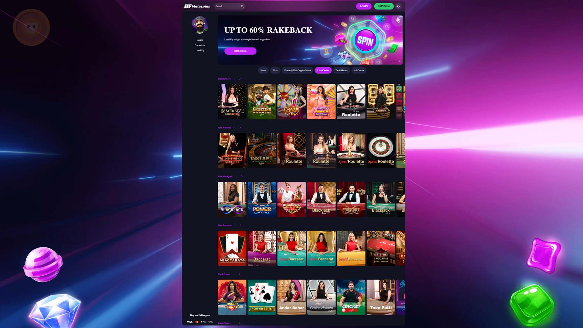 A few dozen casino games with live dealers and hosts are available to all registered players at Metaspins Casino. The good thing is that we have an excellent selection of titles categorized in different ways: roulette, blackjack, baccarat, other card games, and game shows.