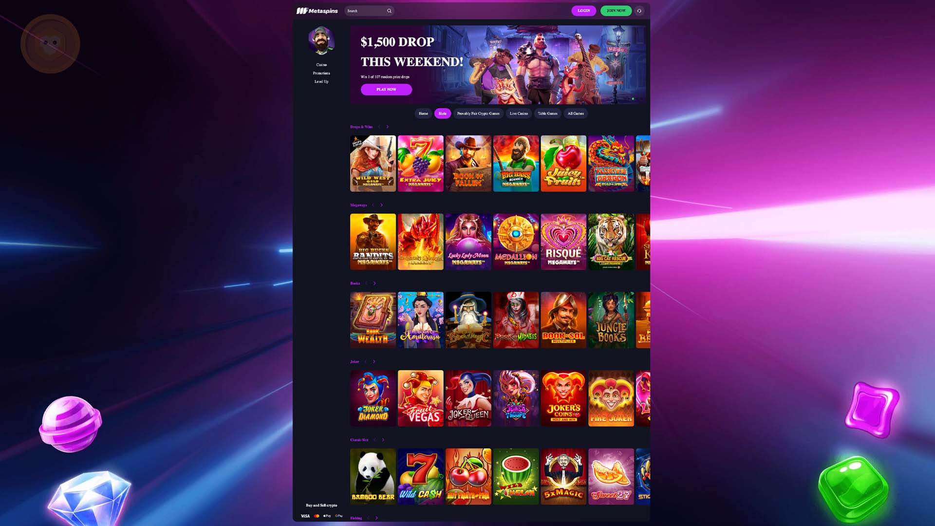 Metaspins Casino’s intention with its appearance is to make players think of cyberspace. Every player gets an avatar and a nickname. You can see a dark purplish background image and massive banners promoting the current offers. Of course, the colorful thumbnails are placed in the center. We also like the opportunity to chat with other users through the column on the left.