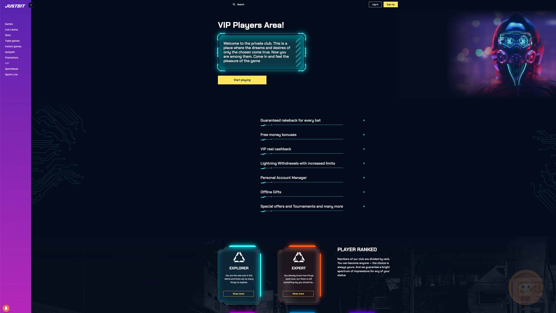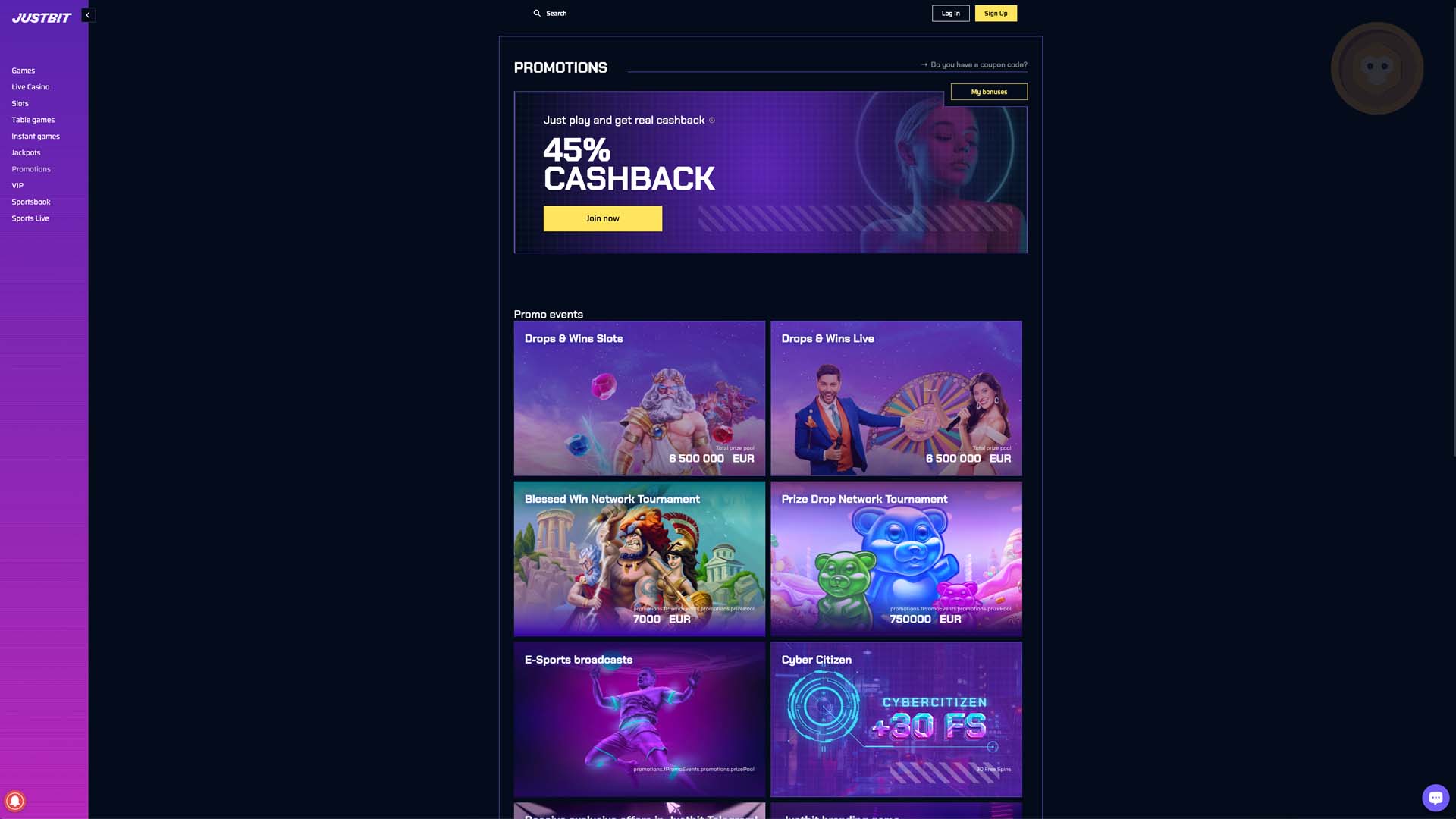 - VIP Program revolves around JustBit Casino. When you join the VIP club, you will get VIP rewards such as rakeback bonuses, cashback bonuses, free money bonuses, and offline gifts. You will also get benefits such as a personal account manager and lightning withdrawals.